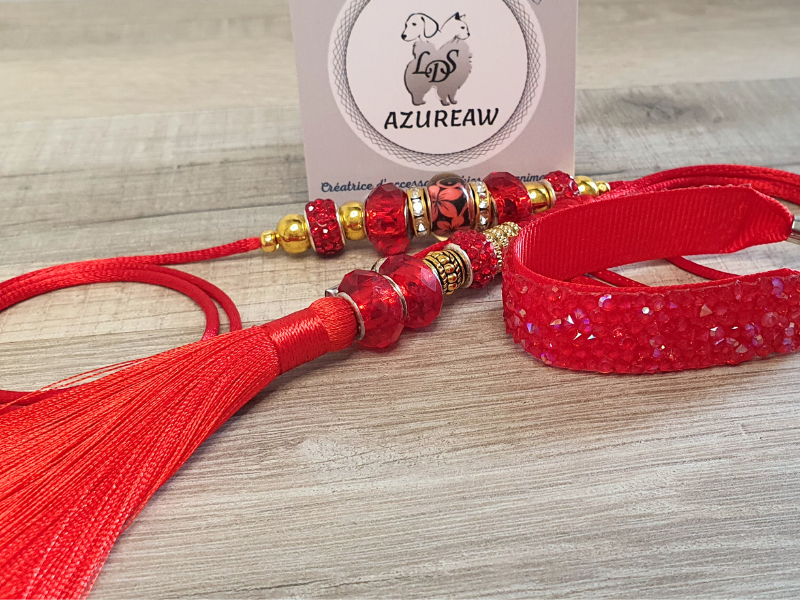 Laisse expo LUXE - ROUGE PAILLETÉ avec poignée et pompon