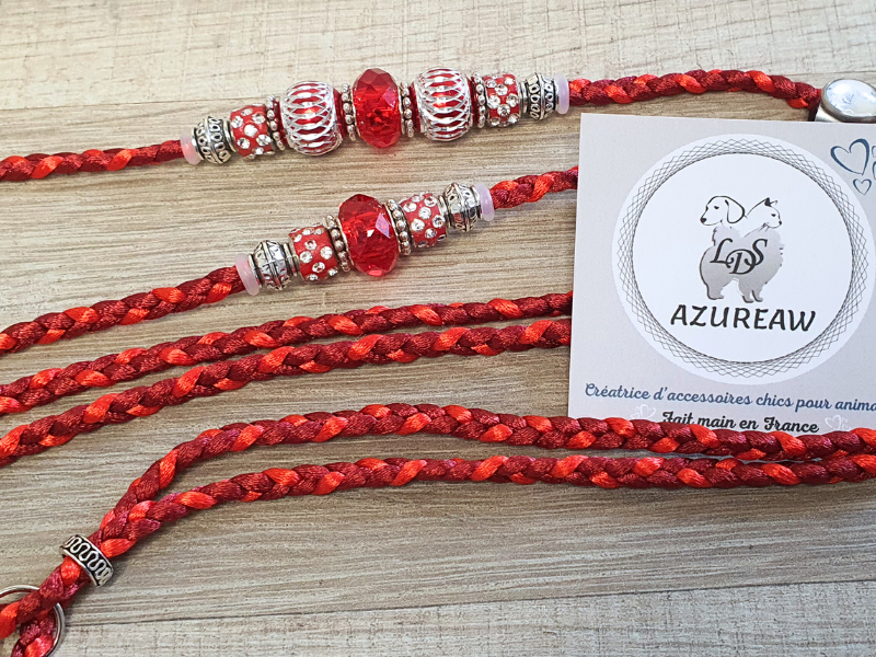 Confectionnée en cordon de satin ultra-doux rouge et bordeaux, elle respecte le poil du chien tout en offrant une prise en main agréable et raffinée.
