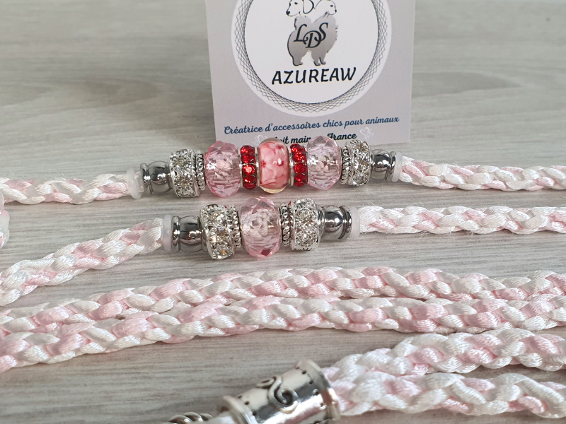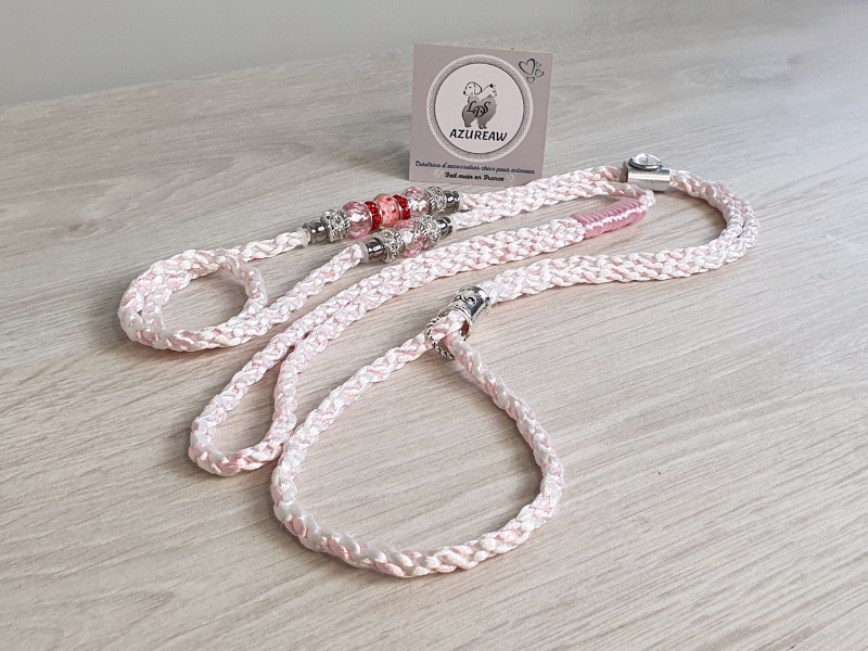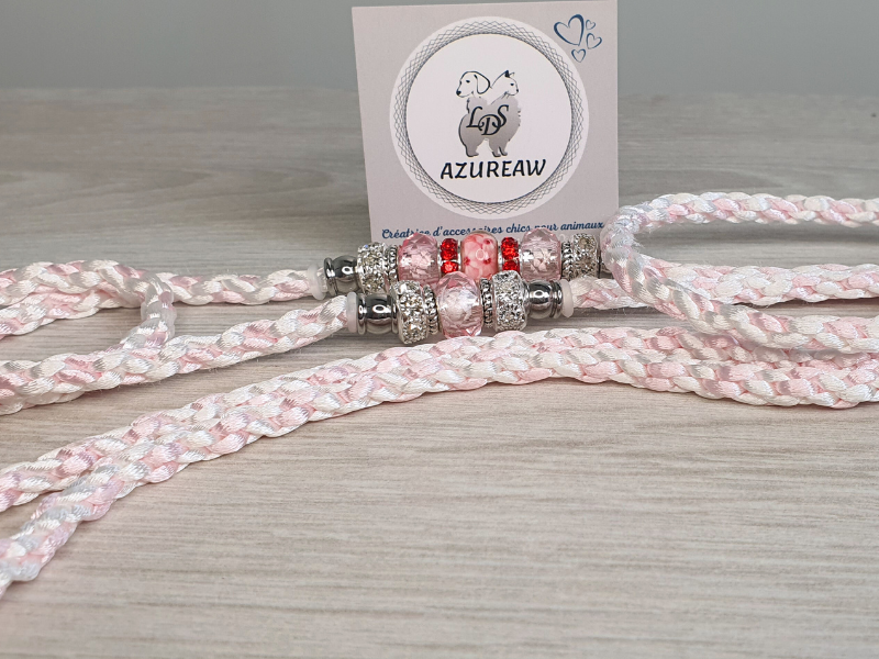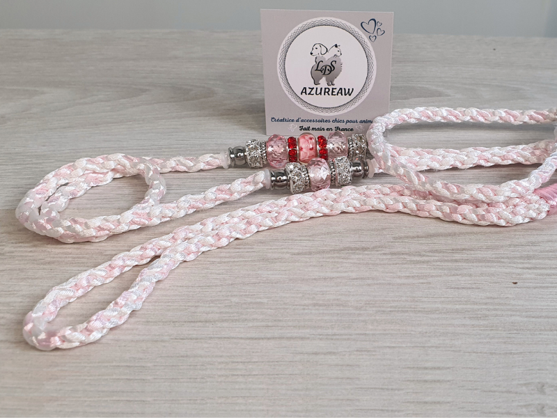 Son tressage en blanc et rose bébé, à la fois doux et résistant, offre une prise en main agréable et sécurisante. Les perles roses aux reflets délicats, associées à des éléments argentés et strass discrets, apportent une touche raffinée et lumineuse, sans détourner l’attention de la prestance du chien en ring.