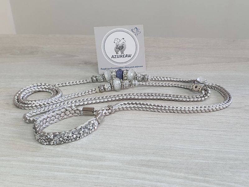 Confectionnée en cordon de satin ultra-doux argent, elle respecte le poil du chien tout en offrant une tenue chic et raffinée.